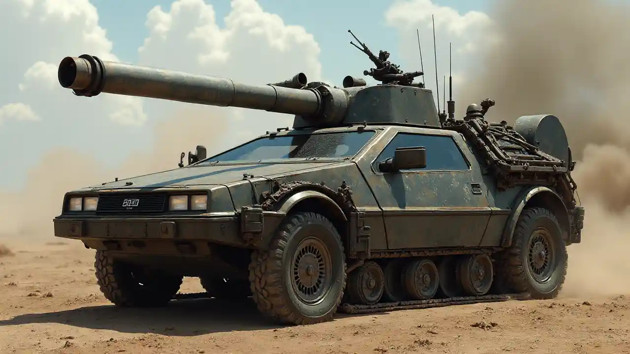 "Retour vers le futur" La machine à remonter le temps de Delory dans le film... convertie en char de l'armée, avec un canon à grand baril sur le dessus.