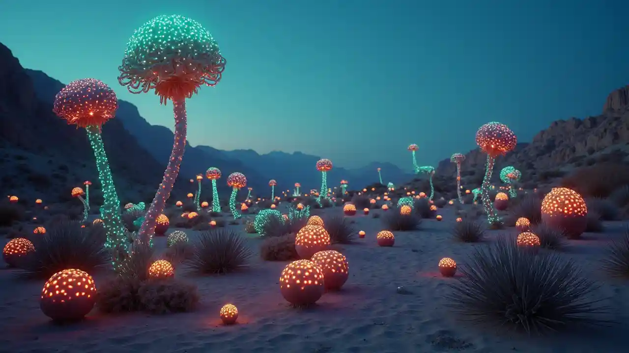Une photographie paysagère d'une scène désertique fantasque pleine de plantes bioluminescentes extraterrestres fictives et spectaculaires, en arrière-plan fixé à l'aube, filmée sur un film Kodachrome, fuyant la lumière, ultra-réaliste.