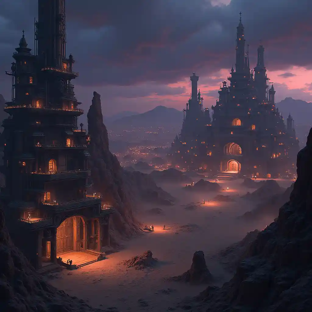 (immense ville steampunk dans le désert), étonnant (lumière nocturne), ciel noir et violet, ville immense, structure mécanique complexe, sentiers immenses, design en bois et métal, paysages poussiéreux, oasis en arrière-plan, atmosphère chaleureuse et attrayante, détails de haute qualité, 4K, atmosphère, contraste dramatique entre l'ombre et la lumière.