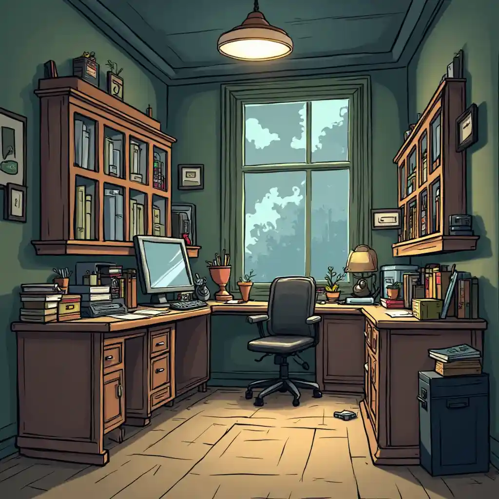 AuroraUne image de style de dessin animé en deux dimensions, un bureau de détective, il est plein de couleurs avec un contour noir dans l'intérieur