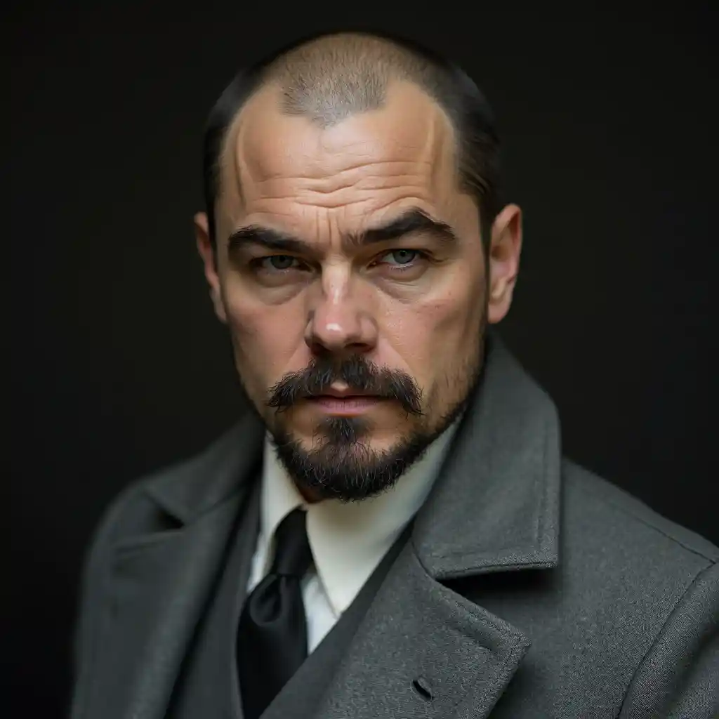 Gros plan portrait de calvitie Leonardo DiCaprio dans le rôle de Lénine, ((calvitie)), (barbe ronde), aux couleurs douces, vêtu d'un costume trois pièces gris et d'un manteau gris, photographié professionnellement, de haute qualité, dans les années 1920, avec la coiffure de Lénine,
