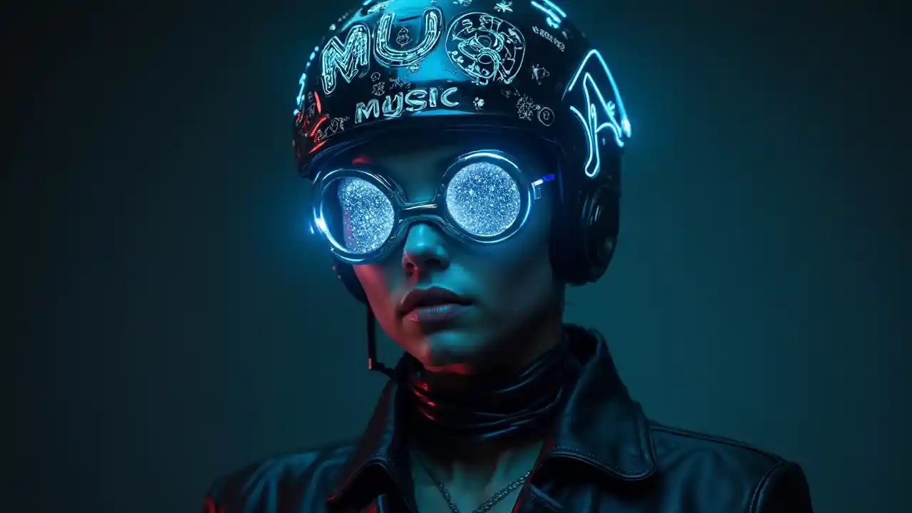 L'image est une œuvre d'art numérique qui semble être le portrait du visage et du haut du corps d'une personne. L'individu portait un casque futuriste sur lequel était inscrit "MUSIC" en néon bleu. Le haut du casque a un dessin semblable à celui d'un crâne, recouvert de motifs et de dessins complexes. Les visières sont également recouvertes de néons, donnant un look futuriste et avant-gardiste. L'individu portait également une veste noire en cuir à col roulé et un collier de choker. Le fond est sombre, ce qui rend la tenue plus visible. L'ambiance générale de l'image est sombre et mystérieuse.
