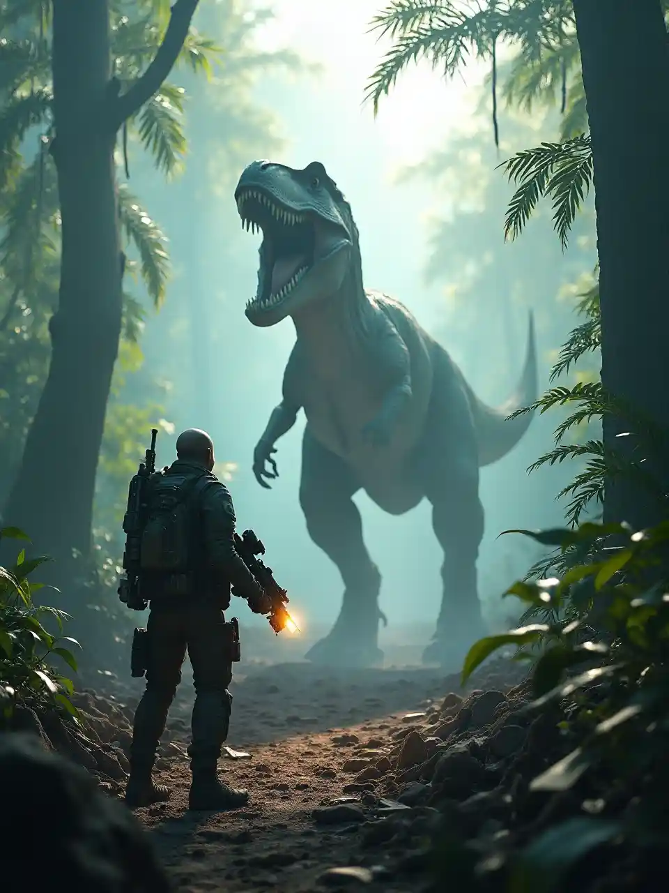 En arrière-plan: une jungle dense et brumeuse avec des fougères imposantes et des arbres géants. La silhouette rugissante d'un tyrannosaure en arrière-plan, la bouche grande ouverte. Un sol fêlé d'une immense marche. Au premier plan: des soldats futuristes (personnage de joueur) armés de fusils high-tech lumineux, face aux dinosaures à venir. Des débris et des vignes brisées encadrent le scénario. Lumière: dramatique, la lumière du soleil tachetée pénètre dans la brume, soulignant la différence d'échelle. Texte clé: "Vivre la préhistoire!"