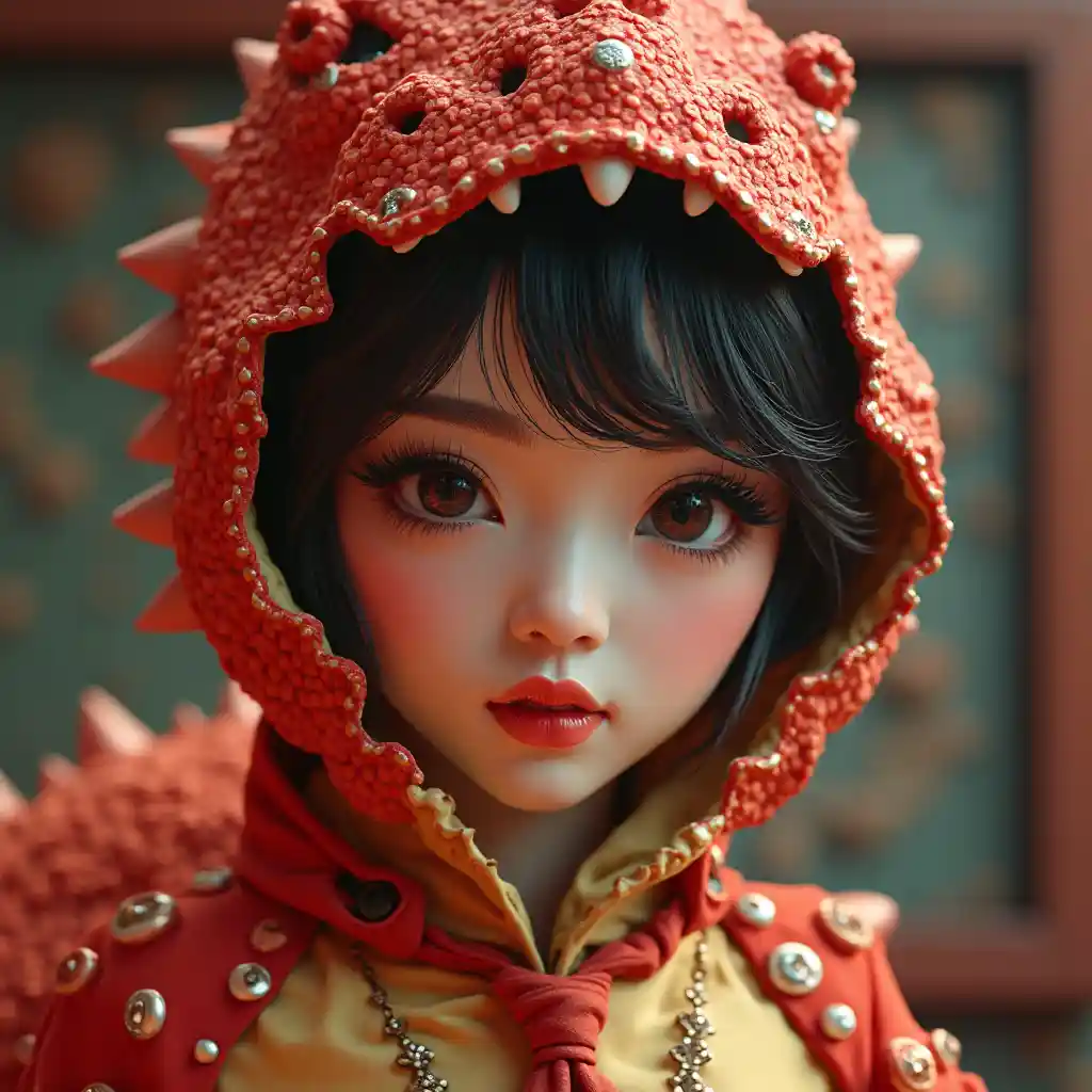 L'étonnant chanteur pop coréen porte des costumes de dinosaures énergiques, avec des yeux symétriques et un réalisme ultra-haute résolution, des détails 8k ultra-réalistes et des lumières dramatiques. Photographiée dans le style photographique, elle porte un rouge à lèvres rouge pastel et des bijoux élégants, insufflant une touche d'art CGI et 3D. Le personnage est rendu par l'indice d'octane, intégrant des dessins animés, des animations, des illustrations et d'autres éléments, et a une qualité semblable à celle d'une poupée. L'image est exécutée sous la forme d'une peinture numérique, montrant des couleurs et des détails riches, avec des nuances texturées telles que des détails de bouton précis et des cravates élégantes. L'oeuvre d'art a une composition volontairement taillée, montrant quelques artefacts JPEG, donnant une véritable impression numérique, encapsulée dans une esthétique rouge basse résolution.