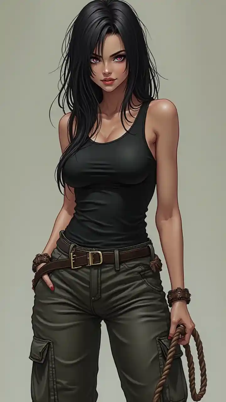 (chef-d'œuvre, la meilleure qualité), 1 fille dominatrice aux cheveux noirs, vêtue d'une salopette sexy, trois points et de grandes poches aux fesses. Elle portait un gilet moulant. Elle a un sourire sadique. Elle a la corde à la main