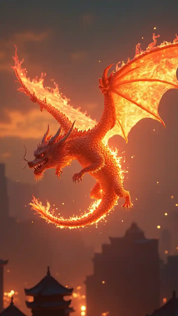 ((Dragon chinois réaliste, nom collectif du feu)), Flying over the Night City ((Fire: 4.5)) Fire and Smoke, Malevoyent, Otherworldly, Magical, Art, Fantasy, Otherworldly Depiction, Digital Art, Concept Art, Cinematic, Hyper Realistic。Postures dynamiques, mouvements dynamiques, films, dessins numériques, ingénieur hyperréaliste, irréel 5, tout rétrécissement, couleurs vives, foudre dynamique. Dans le style de la guilde des artisans, Frank Fazetta, Randy Vargas, Diego Gisbert Llorens, Ciruelo Cabral, Jeffrey Catherine Jones et Marc Simonetti