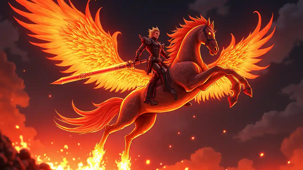 Une scène de combat épique avec des utilisateurs enflammés de chevaux d'ailes et d'épées magmatiques