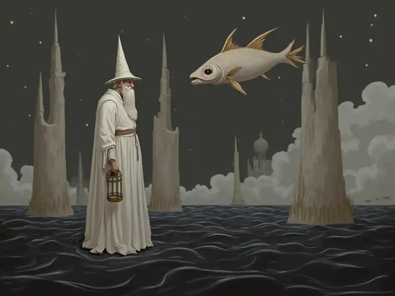 Cette image est un dessin numérique sur le thème de la surréalité, de la fantaisie. Il se caractérise par une robe blanche fluide et un chapeau blanc haut pointé, porté par un vieil homme à longue barbe blanche. L'homme se tenait sur une surface d'eau sombre et planante, qui pourrait représenter une rivière ou une mer, et tenait une petite cage dorée dans sa main droite. L'homme est positionné légèrement à droite de l'image, vers la gauche. Au-dessus de l'homme, un gros poisson jaune argenté, mince et pointue, planait dans les airs, regardant l'homme vers le bas. Le poisson a une nuance subtile d'or qui ajoute un élément de mystère à la scène. En arrière-plan, il y a une vue surréaliste de la ville, avec des structures grandes, fines et abstraites, ressemblant à des tours ou des clochers, peintes dans des teintes pastel de gris et de marron. Les contours de ces bâtiments se reflètent dans un ciel sombre et nuageux, parsemé de minuscules lumières lumineuses, donnant une atmosphère magique. La palette générale est dominée par des teintes froides de gris, marron et blanc, ce qui renforce la qualité éthérée et onirique de l'œuvre d'art. Le style rappelle l'Art nouveau, avec ses lignes fluides et ses formes organiques.