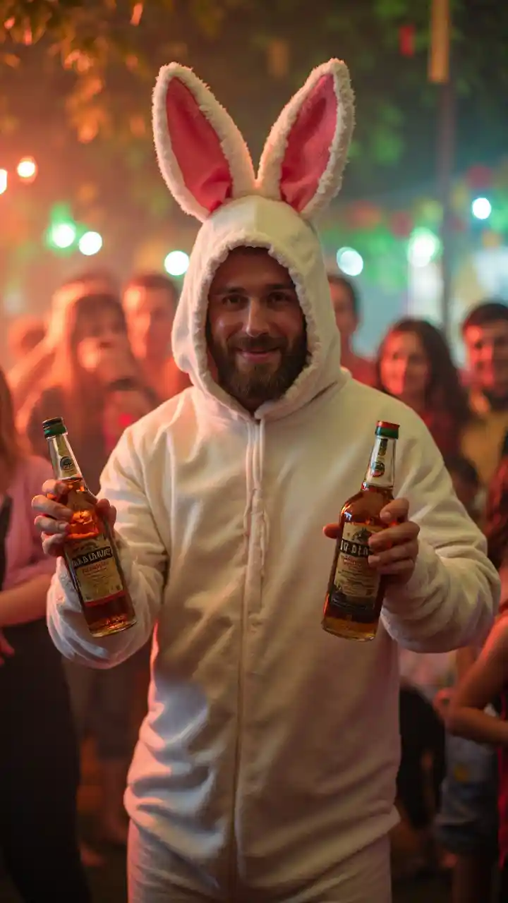 Un homme de 28 ans vêtu d'un costume de lapin et ivre avec une bouteille de whisky à la main lors d'une fête d'enfants