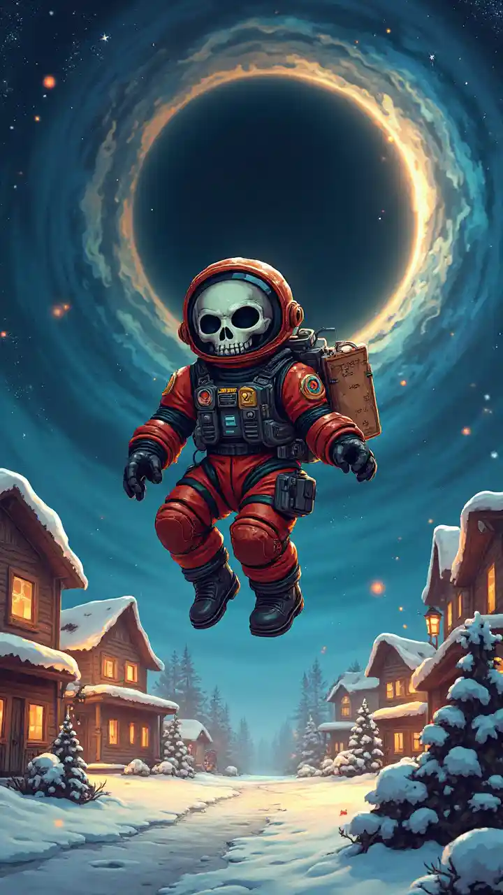 Le crâne et le visage de duke nukem du jeu vidéo "Duka High Detailed Chibi Astronaut" flottent en apesanteur dans l'espace extra-atmosphérique, avec un énorme trou noir tourbillonnant à l'arrière-plan. La scène est colorée et dynamique, avec des éléments cosmiques lumineux et des étoiles. L'illustration est conçue selon un ancien style de peinture classique, avec des textures riches, des coups de pinceau compliqués et une utilisation dramatique de la lumière et de l'ombre, évoquant un sens artistique éternel. Rendement haute définition Ombre fluide Dynamic Lightinge Nukem "Dans la petite ville, Noël, neige, neige, vue du corps entier, brandissant une pancarte indiquant" SD 3.5 sur BasedLabs "