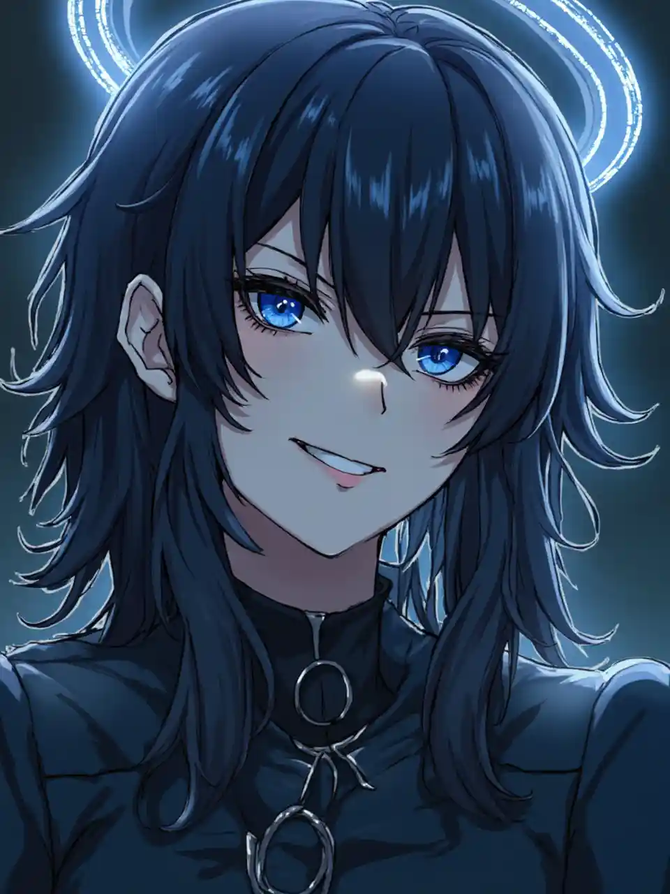 (Chef-d'oeuvre, meilleure qualité, qualité étonnante, très esthétique, haute résolution, ultra-détaillé, absurde, récent,) (thème noir argenté et bleu) (1girl, solo, evil _ grin, black _ eyeliner, angry, close _ up, halo, solo), dysmm _ V