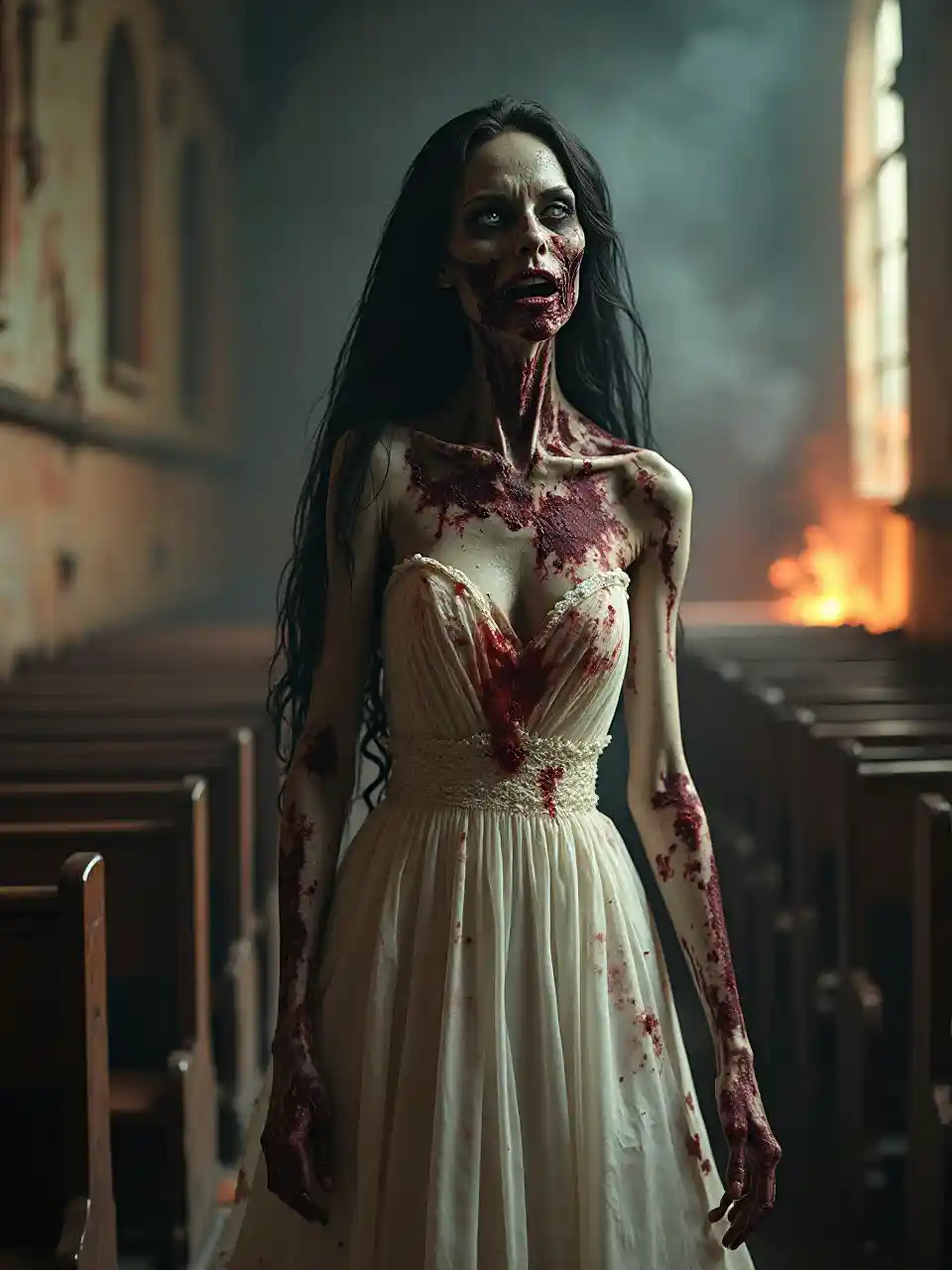 L'image montre une femme zombie belle et vieillissante, son corps couvert de trous et de sang, vêtue d'une robe de mariée déchirée et sale, s'accrochant à son physique d'une manière vaguement inquiétante. Elle s'est relevée lentement et délibérément d'un banc, et maintenant son banc est orné d'un voile noir flottant, qui roule légèrement dans la brise. Cette robe, autrefois blanche et élégante, est aujourd'hui teinte de rouge vif et de teintes sombres, mettant en valeur une conception artistique éthérée et sombre. Les yeux des zombies, blanc laiteux et bleu pâle, traduisent un sentiment de mystère et de décomposition. En arrière-plan se trouve une église en feu, avec du feu et de la fumée dans l'air, ajoutant une touche sombre et terrifiante à la scène.