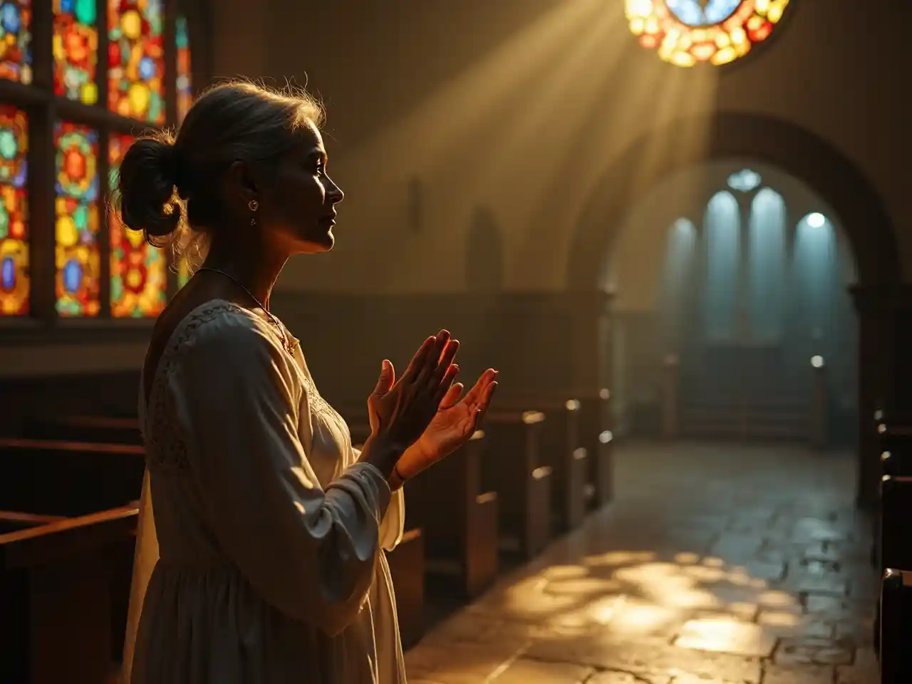 Conseils d'images de films 4K ultra-réalistes (rapport 16:9): Une humble femme noire âgée aux lignes vieillissantes élégantes et aux cheveux rayés argentés se tient seule dans une salle de prière calme et intime. Elle portait une robe d'église blanche simple et fluide avec un accent de dentelle délicat. Ses mains sont doucement levées dans une vénération solennelle, et la riche huile de pommade dorée dégouline lentement du bout des doigts, brillant dans une lumière douce. Un faisceau de lumière chaude et paradisiaque focalisée coule à travers une vitrelle ancienne au design complexe au-dessus d'elle, projetant un reflet vif et coloré sur le sol en pierre sous ses pieds. L'ambiance est remplie d'une lumière douce, éthérée, soulignant le sacré du moment. Angle de l'objectif: un gros plan a été pris d'un faible angle vers l'avant, capturant les gouttes d'huile au premier plan et son expression pleine d'entrain et paisible. Éclairage: Key Light: doux, le faisceau du ciel doré illumine directement ses mains et son visage à travers des vitraux colorés. Lumière complémentaire: la lumière ambiante subtile et la couleur de fond chaleureuse révèlent doucement la texture de la salle de prière. Rétroéclairage: les lumières tamisées et froides créent la séparation et la profondeur à partir de la zone de scène de fond. Sur un fond flou d'une porte légèrement ouverte, une grande scène d'église moderne est presque invisible, les lumières vives s'assombrissent et les sièges vides se transforment progressivement en focus doux, soulignant le contraste entre la force spirituelle cachée et la performance publique. Y compris la profondeur de champ du film: focalisation acérée sur les mains féminines et les expressions faciales sereines, un léger effet de bokeye sur la scène de fond pour renforcer les contrastes émotionnels et symboliques. La texture des vitraux vieillissants, les gouttelettes d'huile lisses et les banquettes en bois usées doivent être très méticuleuses et vives.