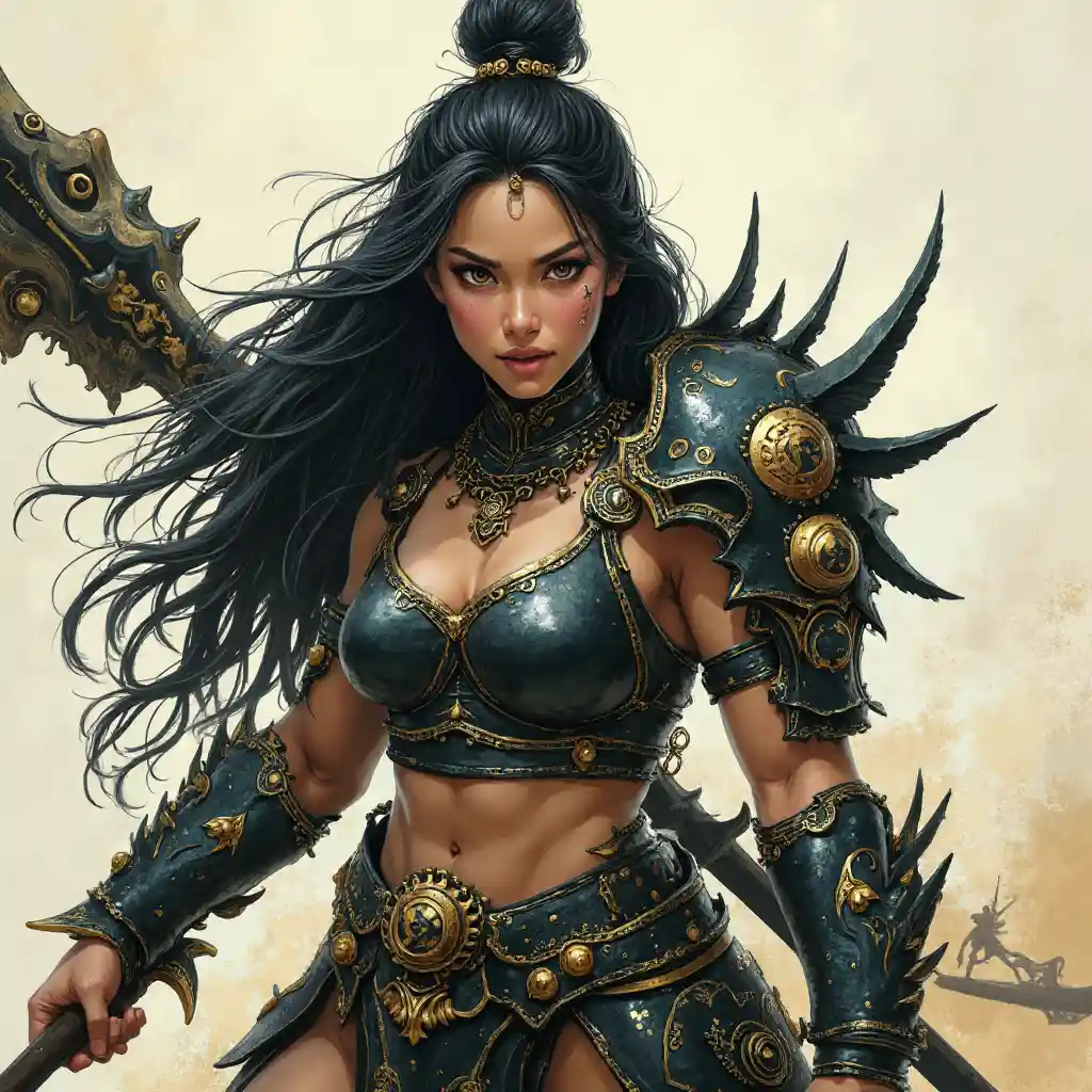 Dessine fort buff Asie Amazon Warrior s'habillent *Une armure agressive et irréaliste faite d'énormes fragments d'obsidienne en dents de scie, avec écrit or, *Un peu de métal doré, avec une sphère d'obsidienne incrustée dans un glyphe magique, révèle son beau visage et ses longs cheveux. Elle devrait brandir une lance d'épée géante faite d'obsidienne en dents de scie et d'or. La sensation de main devrait être forte avec une femme guerrière buff, avec une pointe de culte eldritch. Peintures ultra-détaillées dans un style d'art pictural semi-réaliste eltritch.