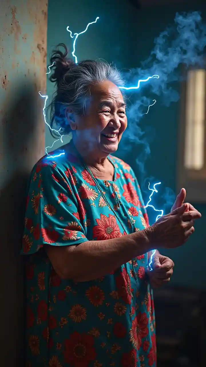 Une vieille dame vive de 70 ans vêtue d'une jupe vive et d'une cage en gazelle a heurté l'interrupteur électrique sur le mur de sa maison et est tombée dans un accident humoristique. Elle a été intriguée par une électrocution qui lui a fait monter les cheveux follement sur la tête et une colonne de fumée ludique s'est élevée de sa tête. Son visage montrait un air noirci de suie, comme s'il était ludiquement saupoudré de charbon de bois, mais elle a ri et a levé le pouce à la caméra. De brillants arcs bleus dansent autour de son corps dans la fumée rotative, le tout capté dans une photographie accrocheuse de haute qualité en 8K avec des effets de lumière dynamiques. Dans ce moment inattendu, son charme spirituel et son humour brillent.