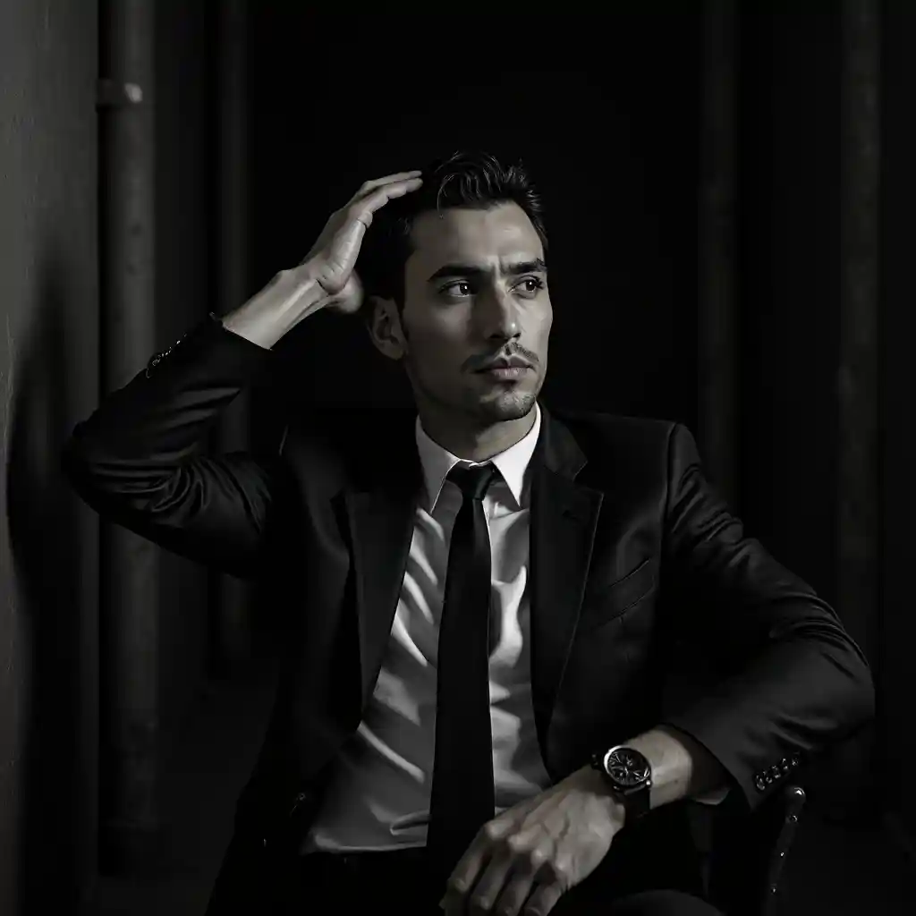 Les personnes vêtues d'un costume noir mat à texture délicate, d'une chemise blanche rafraîchissante et d'une cravate noire étroite se penchent en arrière dans une posture détendue mais confiante. Une main est appuyée près du front et l'autre sur ses jambes. La texture de la peau est délicate, pores sur le visage. Un environnement intérieur sombre et caractériel, avec une touche d'éléments industriels en arrière-plan. Les ombres douces et les murs localement éclairés créent des scènes discrètes dramatiques. Le costume absorbe la lumière avec fluidité, tandis que la chemise en coton présente des plis doux qui reflètent une subtile lumière haute. L'éclairage est artificiel, créant de forts contrastes et des ombres profondes d'un côté. Prise de vue à un angle légèrement inférieur, en utilisant un téléobjectif de 85 mm, la profondeur de champ est relativement faible, le bokeh est déformé et se concentre sur le corps humain, brouillant l'arrière-plan sombre et texturé. Montre noire minimaliste au ton épuré. L'ambiance générale est calme, nerveuse et confiante, avec l'image comme centre avec une palette de couleurs noir et blanc semblable à celle du cinéma, une palette de couleurs et une palette de couleurs professionnelle. Appareil photo: Canon EOS R5, objectif: 85mm f/1,4, ouverture f/1,4, vitesse d'obturation 1/160, ISO 100.