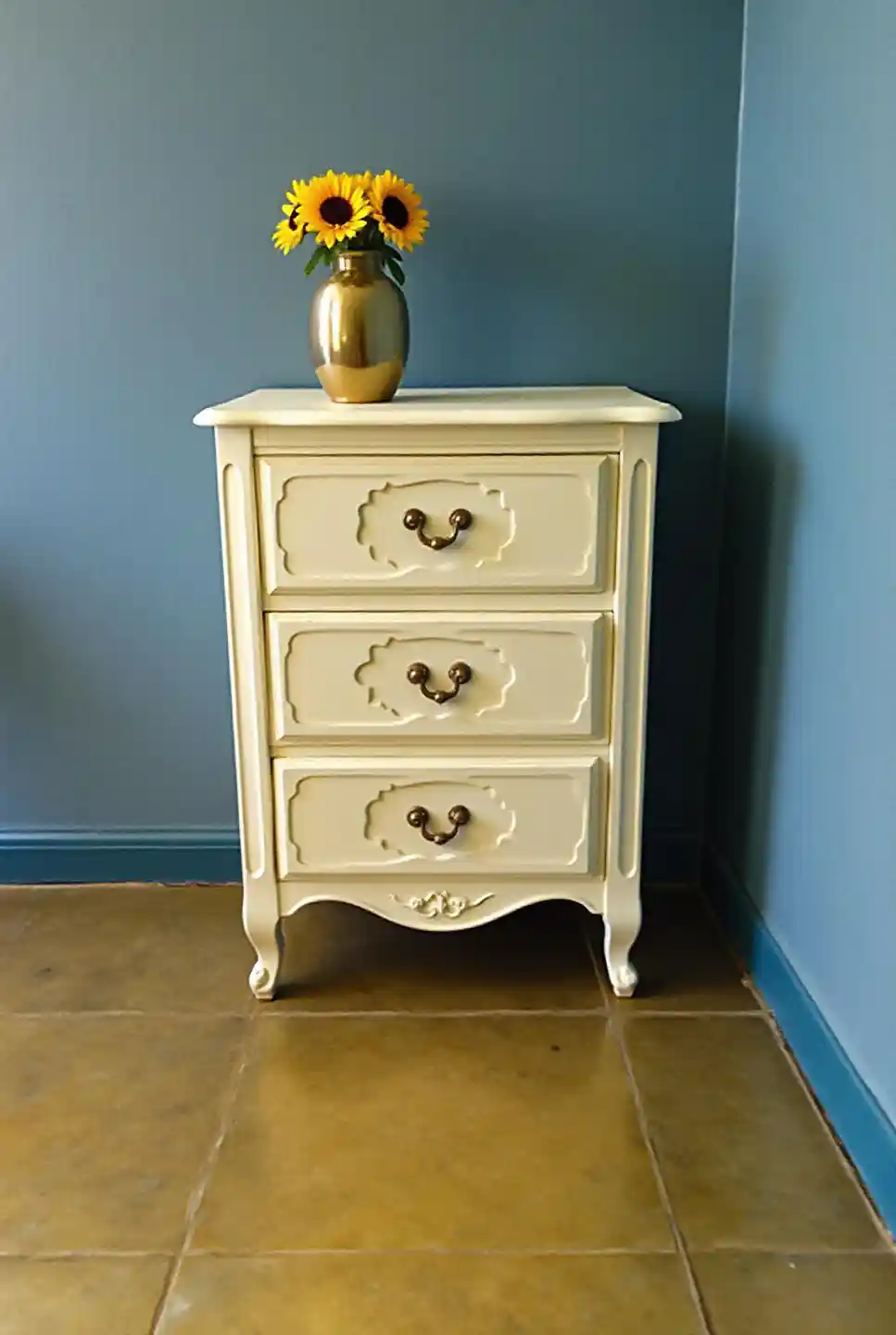 graceBeau sol en carrelage doré, les murs sont décorés en bleu avec un revêtement corrosif, le petit vase sur la coiffeuse est doré avec de petites fleurs de tournesol dessus, la coiffeuse est faite par moi