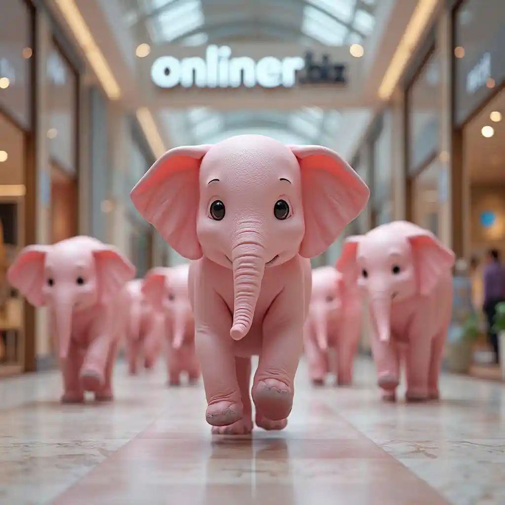 GiselleDe nombreux éléphants roses se promènent dans le centre commercial, et vous pouvez voir le nom du magasin sur l'arrière-plan central du sommet - onliner.biz, UHD, résolution 4K, mouvement dynamique