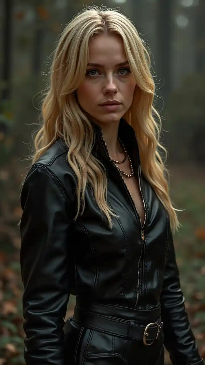 Williamune femme demi-elfe avec de long cheveux blonds une tenue d'assassin en cuir。Elle tiens une é p é e enflarm é e