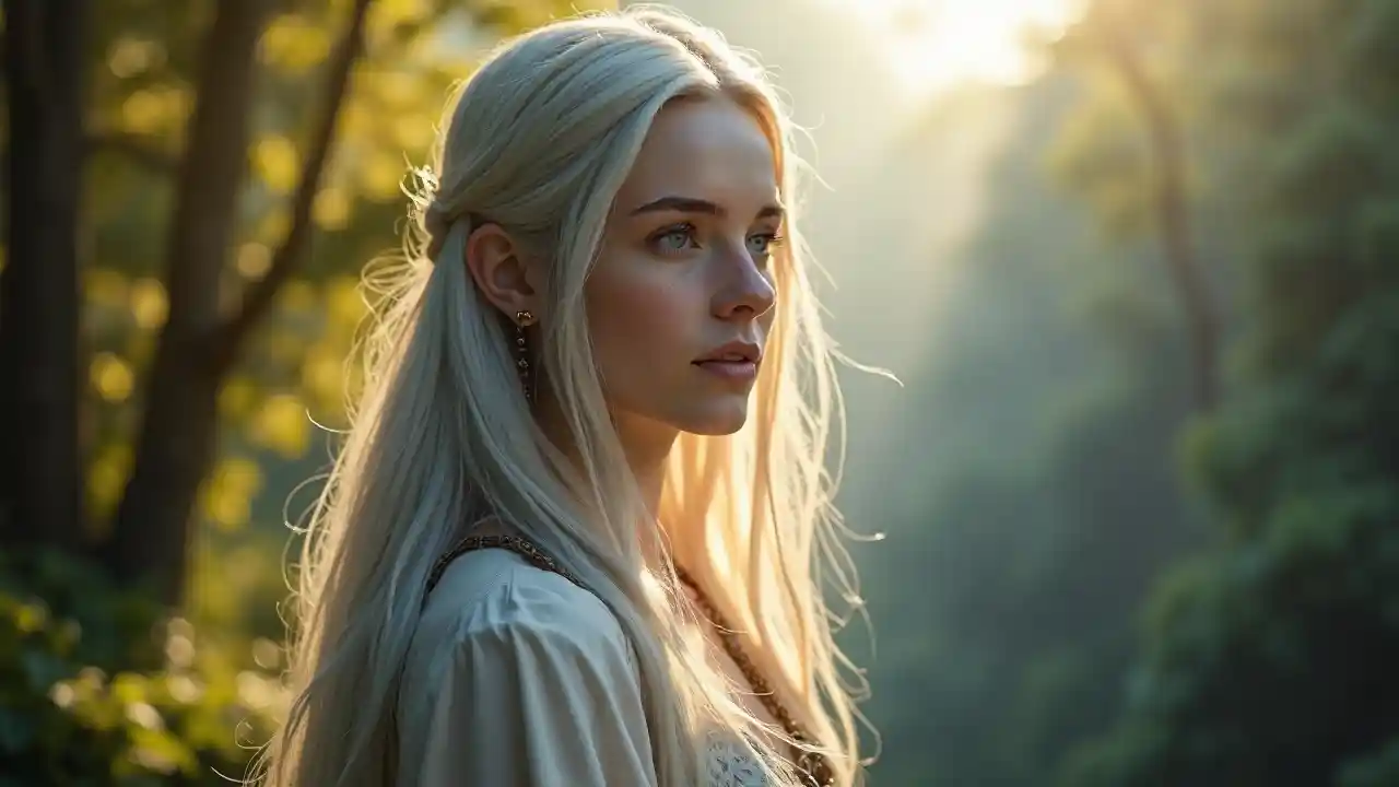 Photographié en 8K (super réaliste, très méticuleux, gros plan sur tout le corps, détails complexes, profondeur de champ dramatique) (femme belle, époustouflante, elfe, (cheveux argentés très longs et droits)), peau pâle, (yeux bleus brillants et naturels), dont la morphologie est parfaitement équilibrée sur fond de vieilles forêts et de canyons (or, brouillard et bleu), près de l'arbre, elle dégage un sens magique