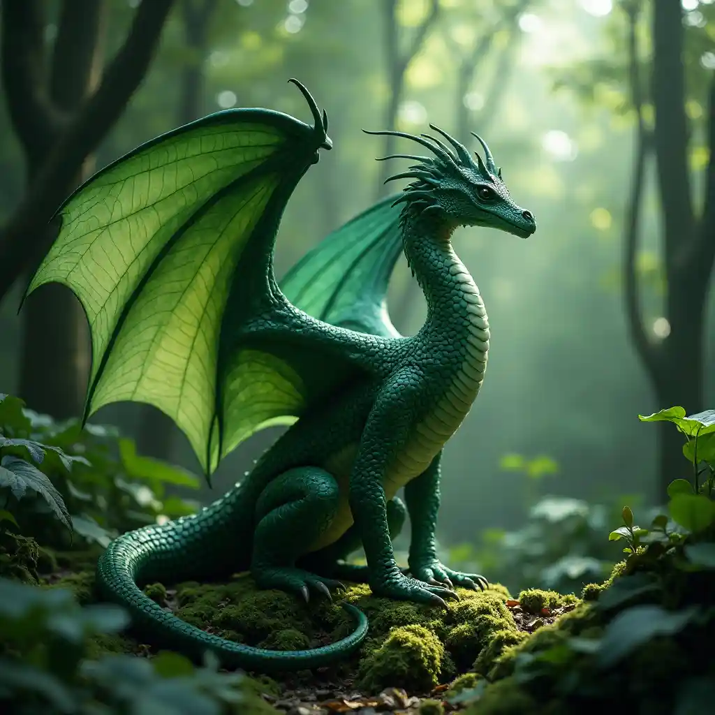 Vert foncé, énorme, grand, (vert pin), dragon de dragon, (énorme, grandes ailes), (ailes hautes, dépliées), (vert jaune, ailes translucides), (longues griffes), mince, serpent, serpent, dans une forêt luxuriante, sombre et verte, (canopée épaisse), (écailles vert émeraude), crocodile, calme, malachite, air paisible, (yeux noirs), un rayon de soleil, assis sur un tapis de mousse. Assis comme un chat, les pattes avant sont longues, le cou est long, le cou du héron, la longue queue gît sur le buisson du premier plan, la queue s'enroule