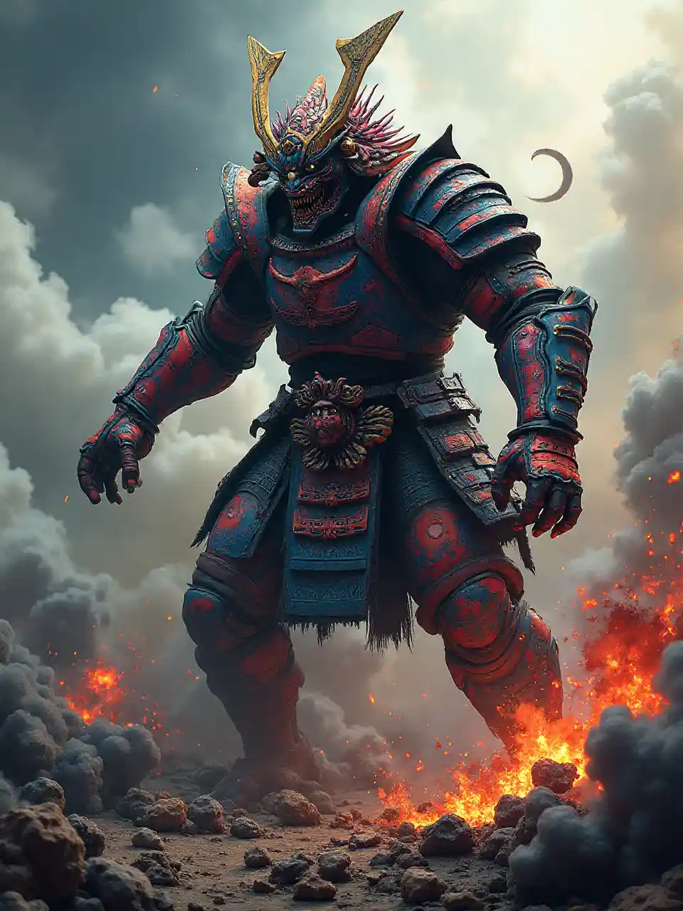 Un mastodonte sacré samouraï grotesque et dynamique, lançant une attaque terrible contre son adversaire, rappelant les coups de pinceau vibrants de Van Gogh mélangés aux détails artistiques de Murano, couvert d'une armure galactique. Des colonnes de fumée noires s'envolent, contrastant avec l'explosion de couleurs intenses. La scène est très détaillée, capte une atmosphère morbide et sombre, et les effets visuels clés suscitent un sentiment d'admiration. La représentation est hautement réaliste, présentée dans un plan épique ultra-large, qui plonge le spectateur dans cette confrontation surréaliste.