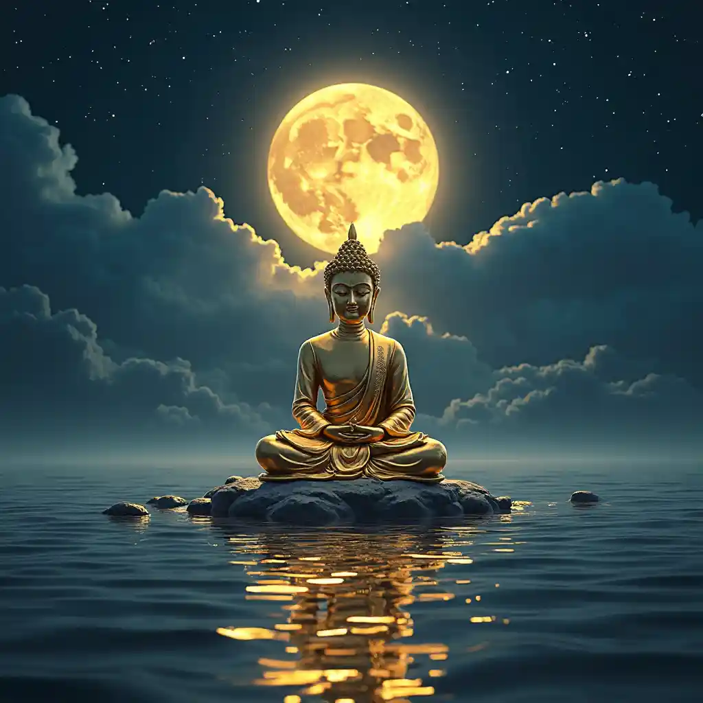 Scène étonnante et éthérée, un Bouddha d'or radieux est élégamment assis sur l'eau, illuminé par la pleine lune brillante dans le ciel nocturne. L'image séduit par des éléments ludiques d'illusion optique, donnant vie au Bouddha dans une danse surréaliste de réflexion et de lumière. Le style rappelle l'art de sketchfab, avec une qualité d'image ultra-haute définition, capturant chaque détail et texture complexes. Il y a une sorte de tranquillité et de mystère dans l'atmosphère, plus intense sur fond de vagues douces et de subtils motifs célestes dans le ciel, évoquant un sentiment de tranquillité et de merveille.