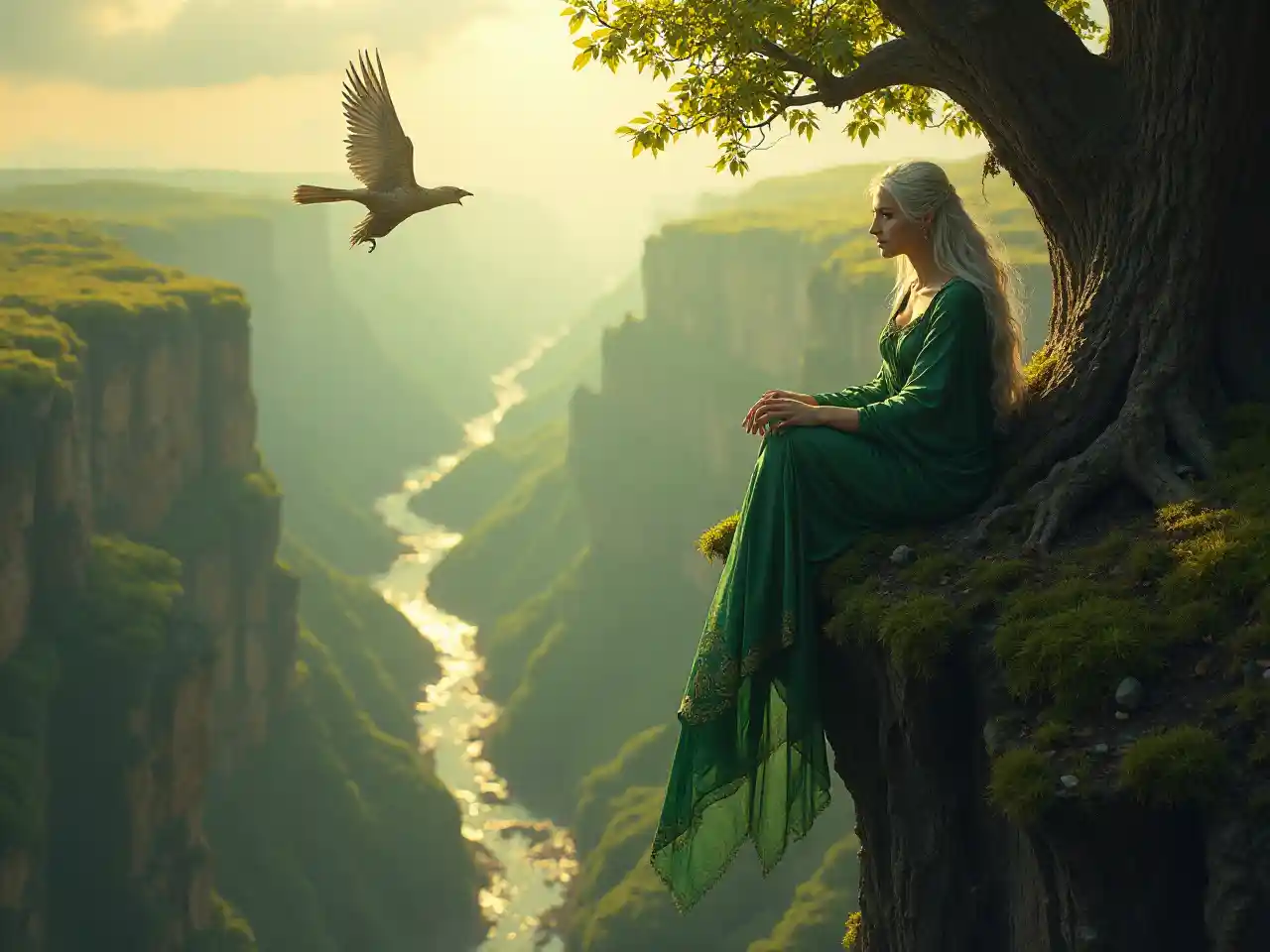 Une femme elfe époustouflante aux yeux émeraudes brillants et aux cheveux argentés, élégamment assise sur le bord d'une énorme branche d'arbre, au-dessus de laquelle se trouve un vaste canyon baigné de brume dorée. Sa cape flotte doucement dans le vent, brodée de runes légèrement scintillantes. En contrebas, le canyon s'étend et la rivière Light serpente à travers les pierres anciennes. Un aigle plane silencieusement. Réalisme aérien, majestueux, fantastique.