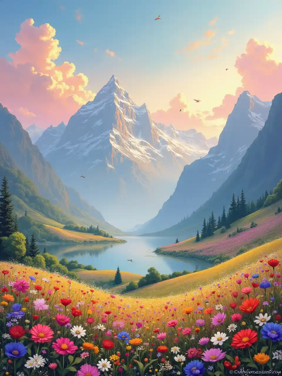 Paysages vibrants et éthérés, le ciel doux rencontre des horizons scintillants, parsemés de nuages lumineux. Des montagnes majestueuses s'élèvent comme d'anciens gardiens, leurs sommets sont recouverts de brume dorée. Le paisible lac illumine les tons de guimauve au-dessus, tandis que les oiseaux délicats dansent tout au long de la scène. Les fleurs sauvages luxuriantes et ondulantes couvrent la terre et leurs couleurs riches créent une beauté naturelle dispersée. Ce panorama fantastique et extraordinaire ressemble à une porte d'entrée vers un monde imperméable au temps, invitant le public à se perdre dans sa tranquillité et sa splendeur.