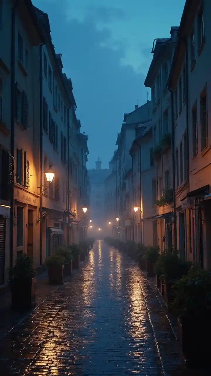 Rue européenne, nuit, chefs-d 'œuvre, détails, éclairage de volume, pluie, (chef-d'œuvre, meilleure qualité, absurde, haute résolution), qualité étonnante, très esthétique, (éclairage de volume), esthétique de dessin, dessin conceptuel, Ultra HD