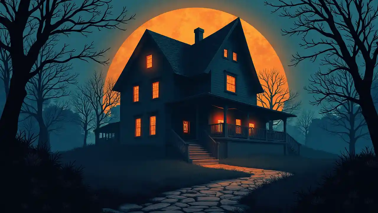 Affiche d'Halloween pour une nuit d'horreur, maison hantée maléfique, teintes orange et bleu foncé, humeur insidieuse