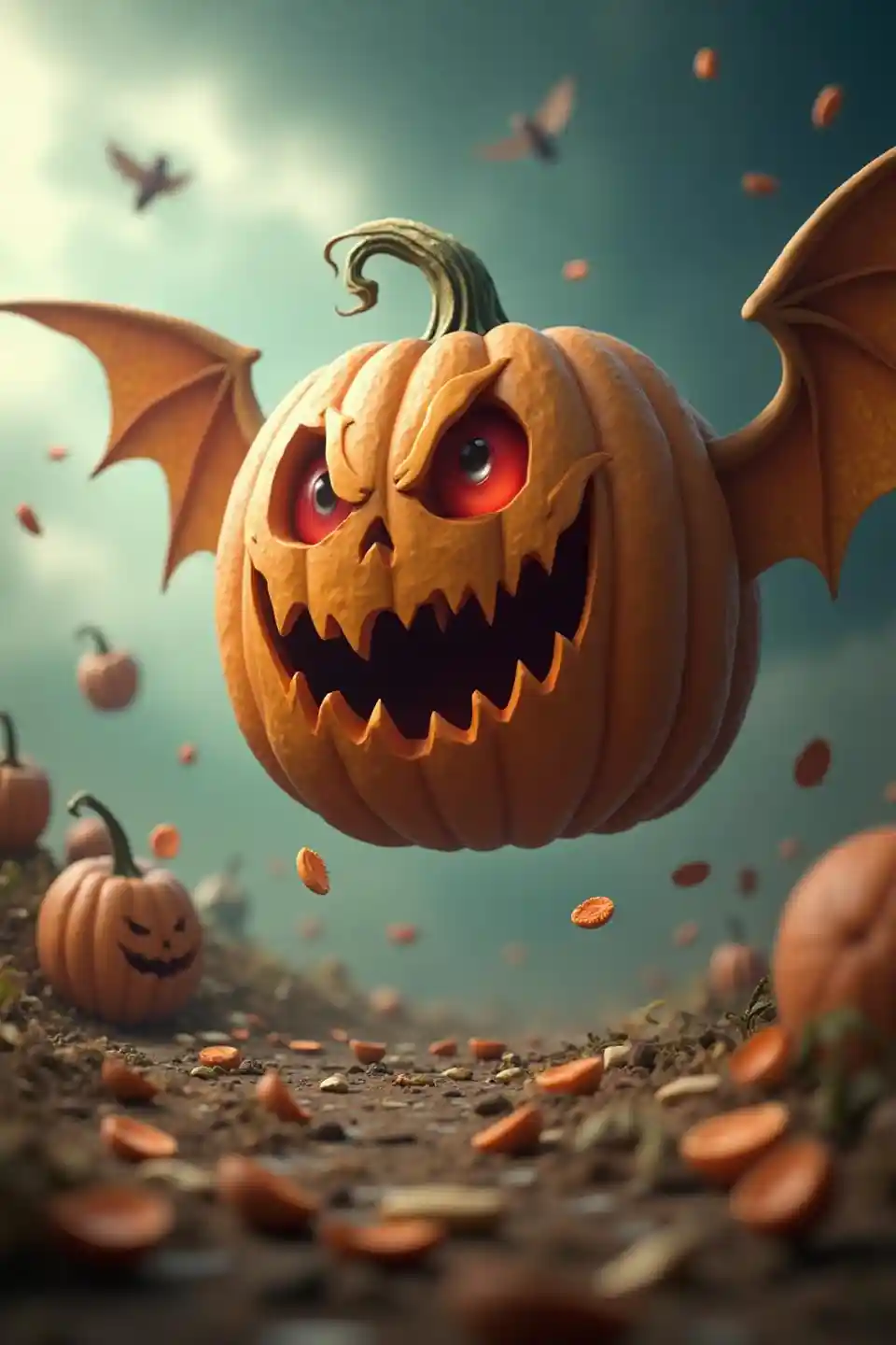 Une méchante citrouille survole le ciel, attaque en lançant des graines de citrouille, une expression terne, lumière naturelle, ultra haute définition, description précise, réaliste, réaliste, réaliste