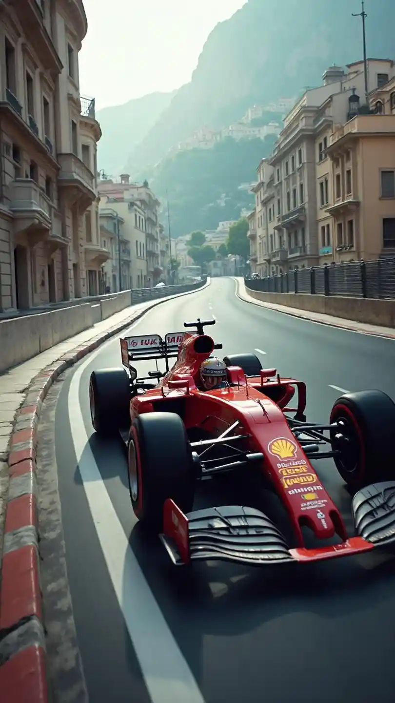 laaaaraUn coup puissant pour une course de F1 pleine de vitesse et de sensations fortes. Une voiture de F1 fait la course près du parcours urbain de Monaco. Un mur s'approche à côté de la F1 rouge. The ti