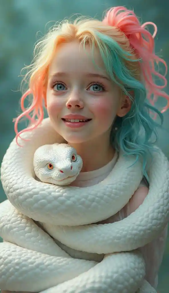 Serpent blanc géant avec fille aux cheveux arc-en-ciel