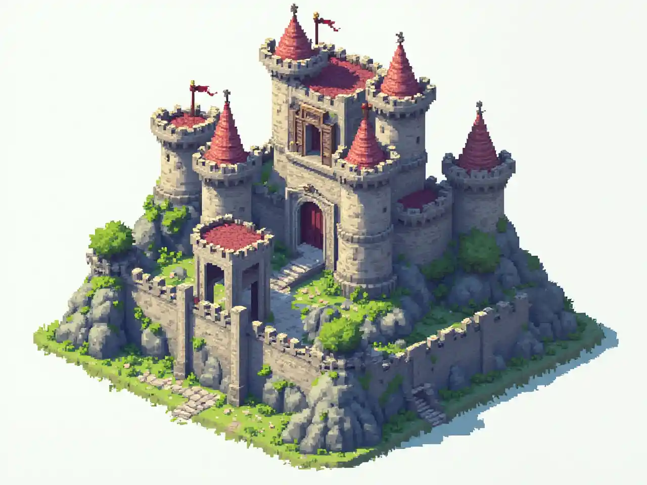 Art pixel du château fantastique médiéval, design adapté à l'intérieur en carrelage 64x64. Le château devrait être visuellement clair à petite échelle, avec des tours, des murs et des portes bien définis. Vue descendante ou équidistante, optimisée pour une utilisation dans les stratégies 2D ou les cartes de jeu RPG. Des couleurs lumineuses et lisibles avec un bon contraste, évitant les excès de détails qui ne permettent pas de bien zoomer. Contexte transparent.