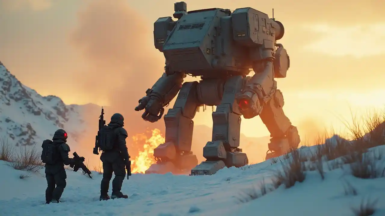 Film d'objectif de théâtre statique, contraste élevé: 1. Un film de cinéma de théâtre, style de photographie couleur créative artistique, miroir d'image, granulés de film, (machine de guerre inspirée de Maskinen Krieger ultra-détaillée, résolution 32K. Une mécanique bipède imposante, lourdement blindée, avec de l'industrie. Des flammes et une épaisse fumée s'échappent du moteur en dessous. Deux blindés armés de mitrailleuses étaient à la réception. Le lieu est la montagne d'hiver enneigée au coucher du soleil.), Détails fantastiques, détails fantastiques