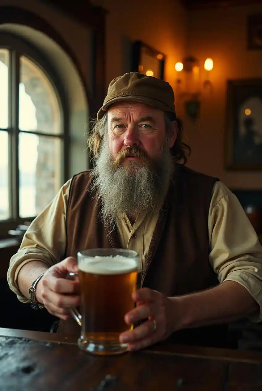 Photographie vidéo secrète, texture naturelle, lumière très réaliste, éditorial, perspective ascendante du Hobbit. Du film "Le Seigneur des Anneaux", il y a un nain barbu, portant un gilet, un chapeau de bas, un nez rouge rond, de haut en bas, Boire de la bière dans la taverne, dans un environnement fantastique, ultra-réaliste, objectif 35 mm, artisanat croisé Agfa CT Precisa 100, orange brillant doré, vision de classement des couleurs professionnelles, ambiance scandinave, Diffusion lumineuse, prise de vue de taille moyenne, prise de vue grand angle du corps principal à moyenne distance