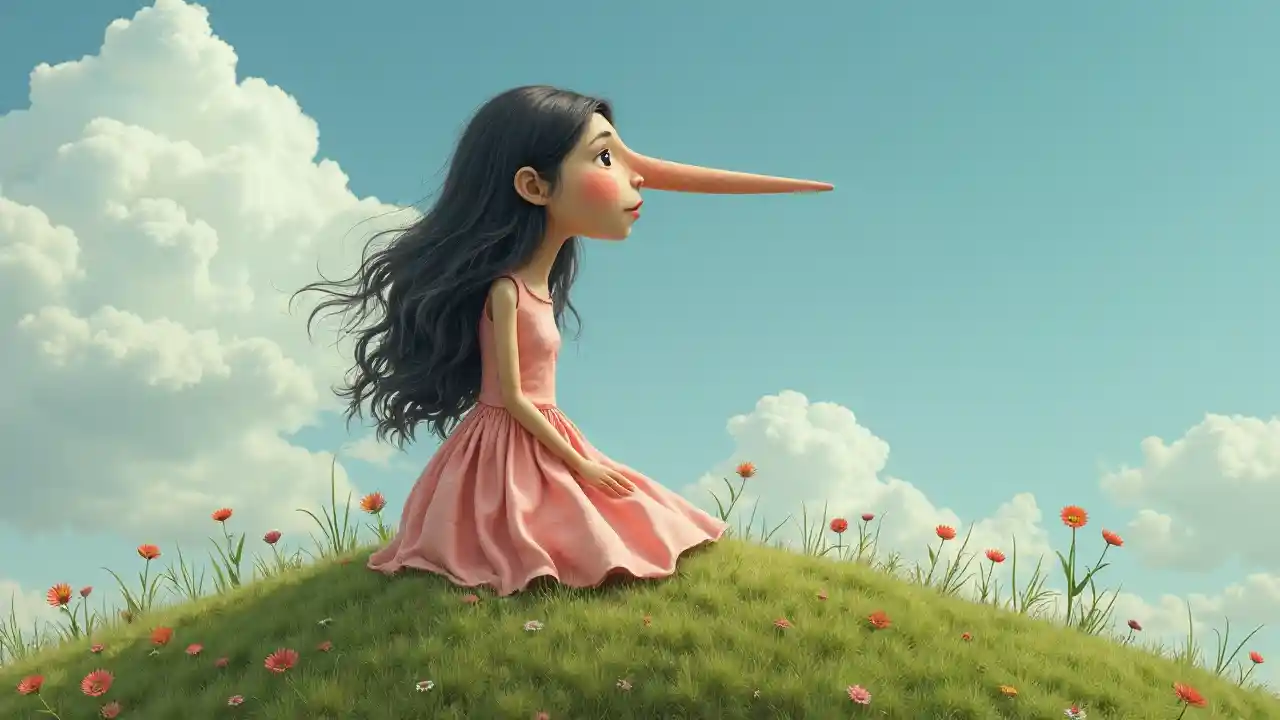 Nez long, cheveux noirs, montagnes herbeuses douces, habillage naturel, ciel bleu et nuages blancs, nez mince, grands yeux, lèvres rouges, contes de fées, silhouettes minuscules, réalisme surréaliste, anatomie, rose, veines, fantasque, rose, texturé, nostalgique