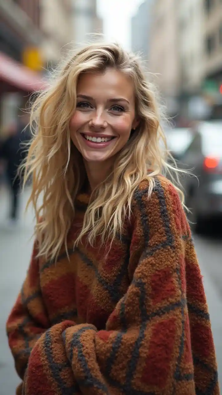 (Mode des années 80:1,3), femme blonde au hasard, yeux légèrement obliques, lèvres charnues, couleurs naturelles, joie, sourire, poncho, urbaine,