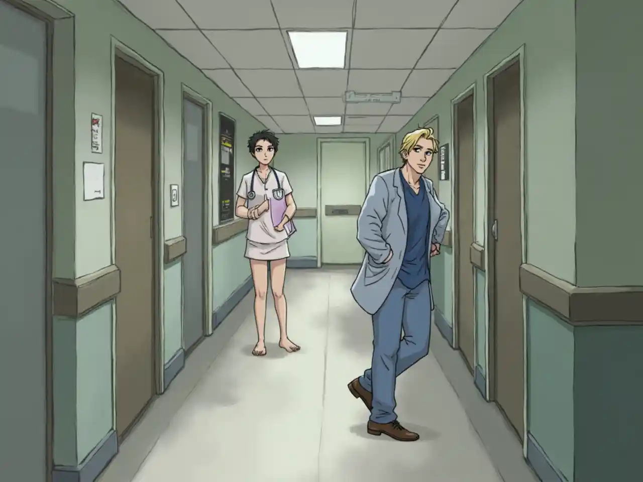 Aubrey@ E8AjwETTD6mOnkeP2CGO debout dans le couloir de l'hôpital à gauche. @ Papa qui est de droite