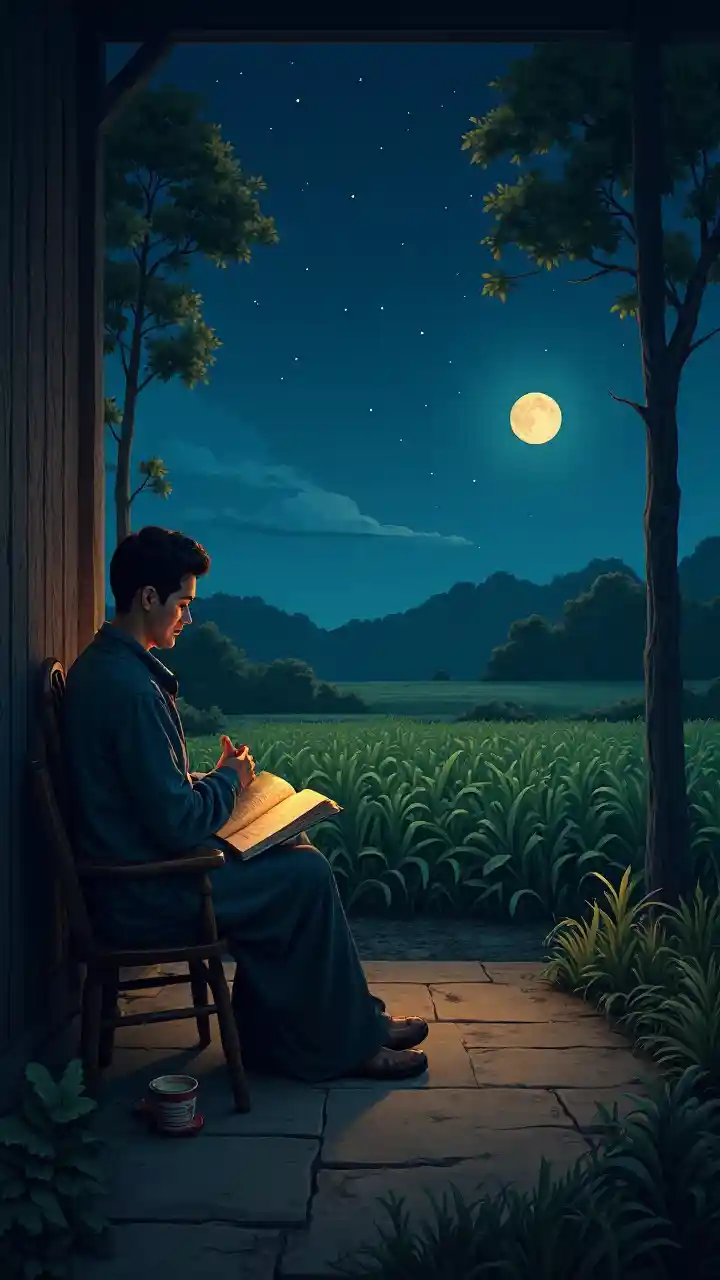 Assis le soir sur le porche pour lire un livre et boire du thé ou du café, on peut voir un champ de culture, Fathi Hassan, photographie d'art, nuit, illustrations de livres de contes