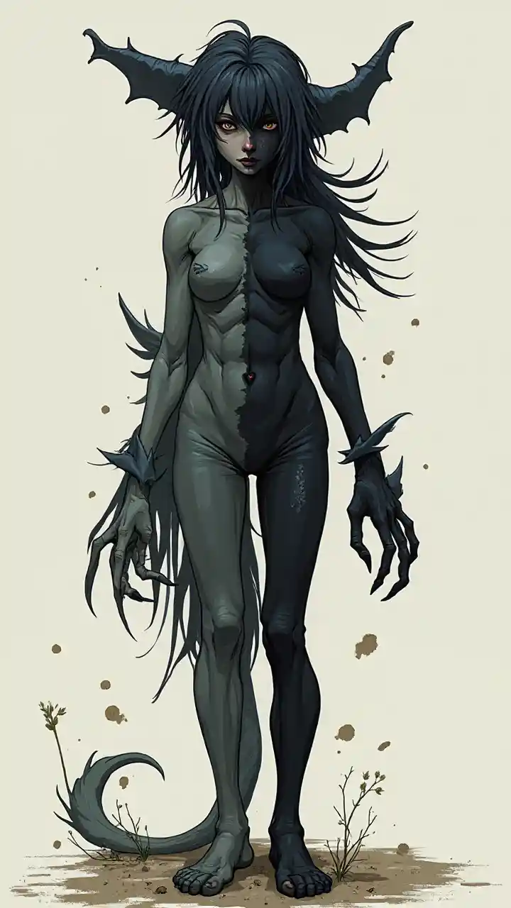 Moitié monstre (corps de droite) et moitié fille humaine. Le côté monstre (de gauche) est une bête vide. Féminin