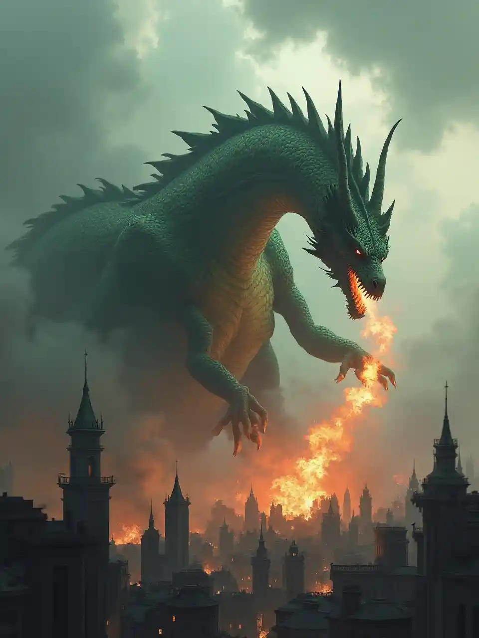 AubreyUn énorme dragon vert a craché le feu et a détruit une ville en contrebas dans un monde ombragé.