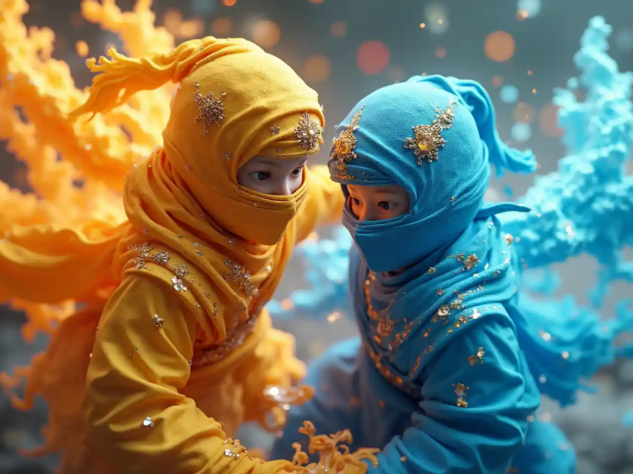 Rendus 3D étonnants du Ninja jaune et du Ninja bleu, qui incarnent respectivement les éléments du feu et de la glace. La scène est caractérisée par des accents dorés et des détails complexes de textures de diamants, soulignant le contraste entre l'énergie enflammée du ninja jaune et l'aura éblouissante du ninja bleu. Dans un équilibre harmonieux entre mouvement dynamique et sérénité, les représentations hyperréalistes capturent l'essence de la puissance de leurs éléments. La disposition artistique avec un rapport hauteur/largeur de 2:3 injecte des couleurs vibrantes et un mélange charmant de réalisme exquis dans la scène.