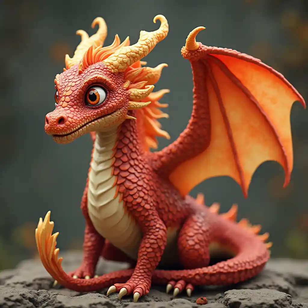Dragon réaliste avec des écailles rouges et orange pâle, de grandes ailes, qui ressemblent à des flammes sur la tête, une barbe jaune.