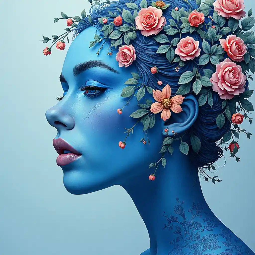 ScarlettProfil artistique Les femmes bleues très méticuleuses ont le visage couvert de fleurs, les yeux bleus, les lèvres épaisses