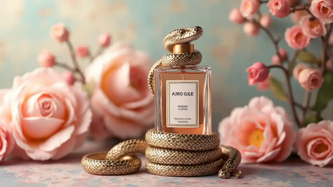 Fond floral avec bouteille de parfum et serpent