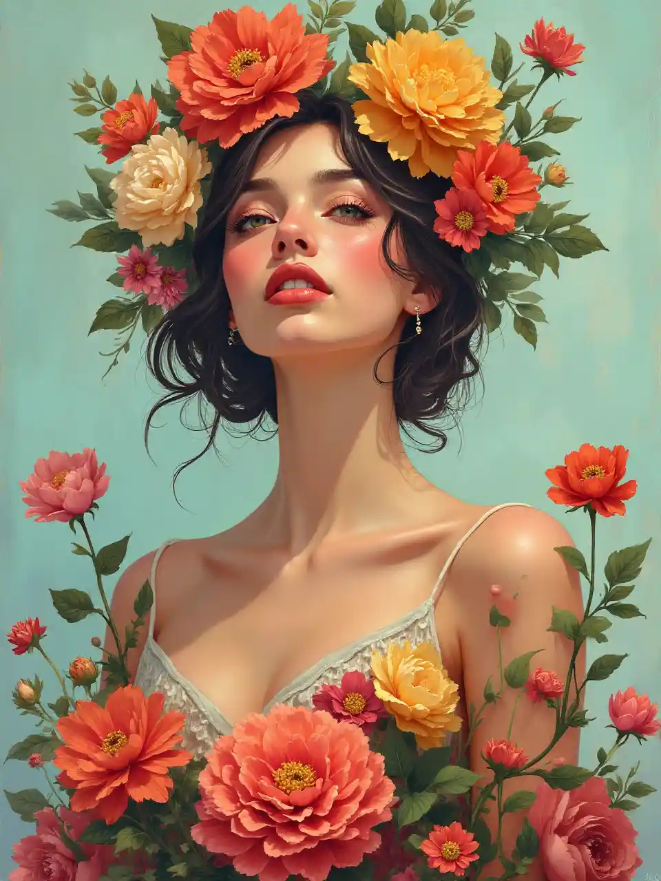 Illustration commerciale Une femme vêtue de fleurs et plantée dans ses cheveux, dans le style d'un germe artistique, un coloreur vibrant, franciszek starowieyski, michael malm, capturant l'essence de la nature, palette de couleurs pour embrasser le soleil, illustration-ar 58:77-s 750--style raw