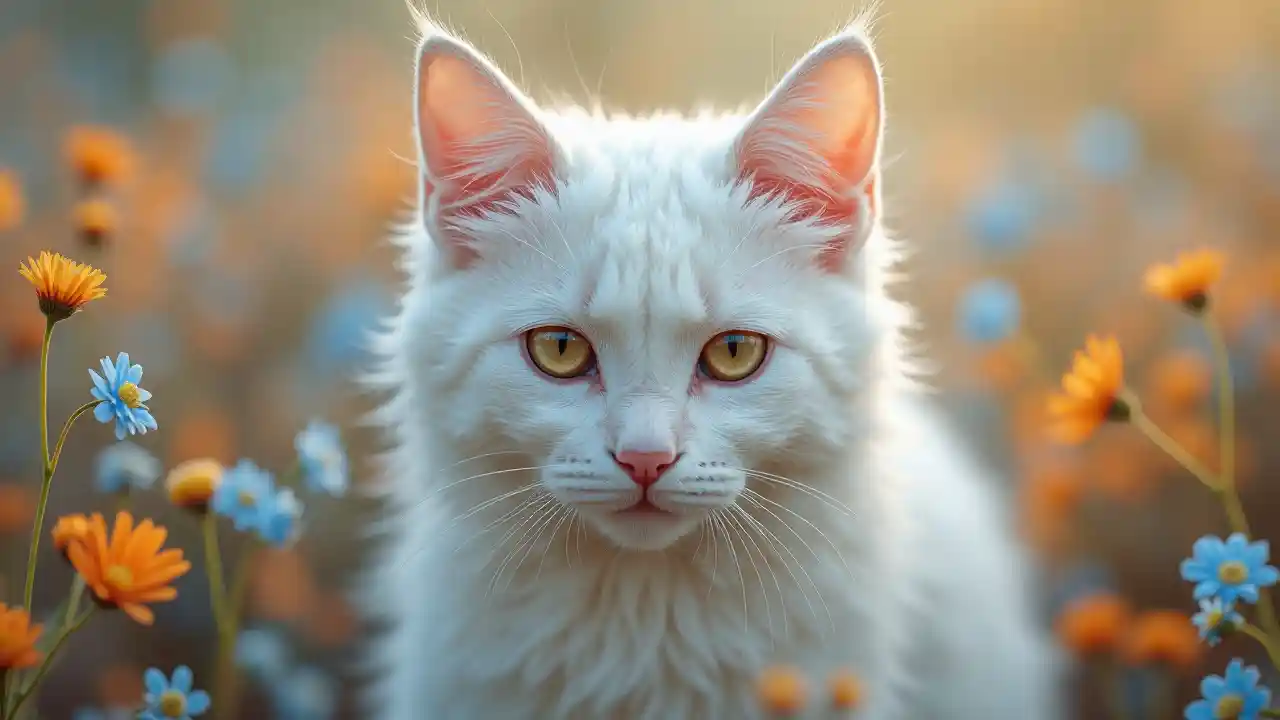 Une photo ultra réaliste avec des détails, un chat velu blanc entouré de fleurs orange clair et bleu, avec des détails complexes, (sensation de film, lumière douce, acuité: 1,2), (couleurs douces: 1,5), (grain de film, bokeye, fond flou), photographié avec un objectif Nikon z30, 24mm, (DOF: 1,4), mise au point claire, texture réaliste, regarder le spectateur, bonnes proportions, Anatomiquement correct < embed: epiCPhoto.pt >