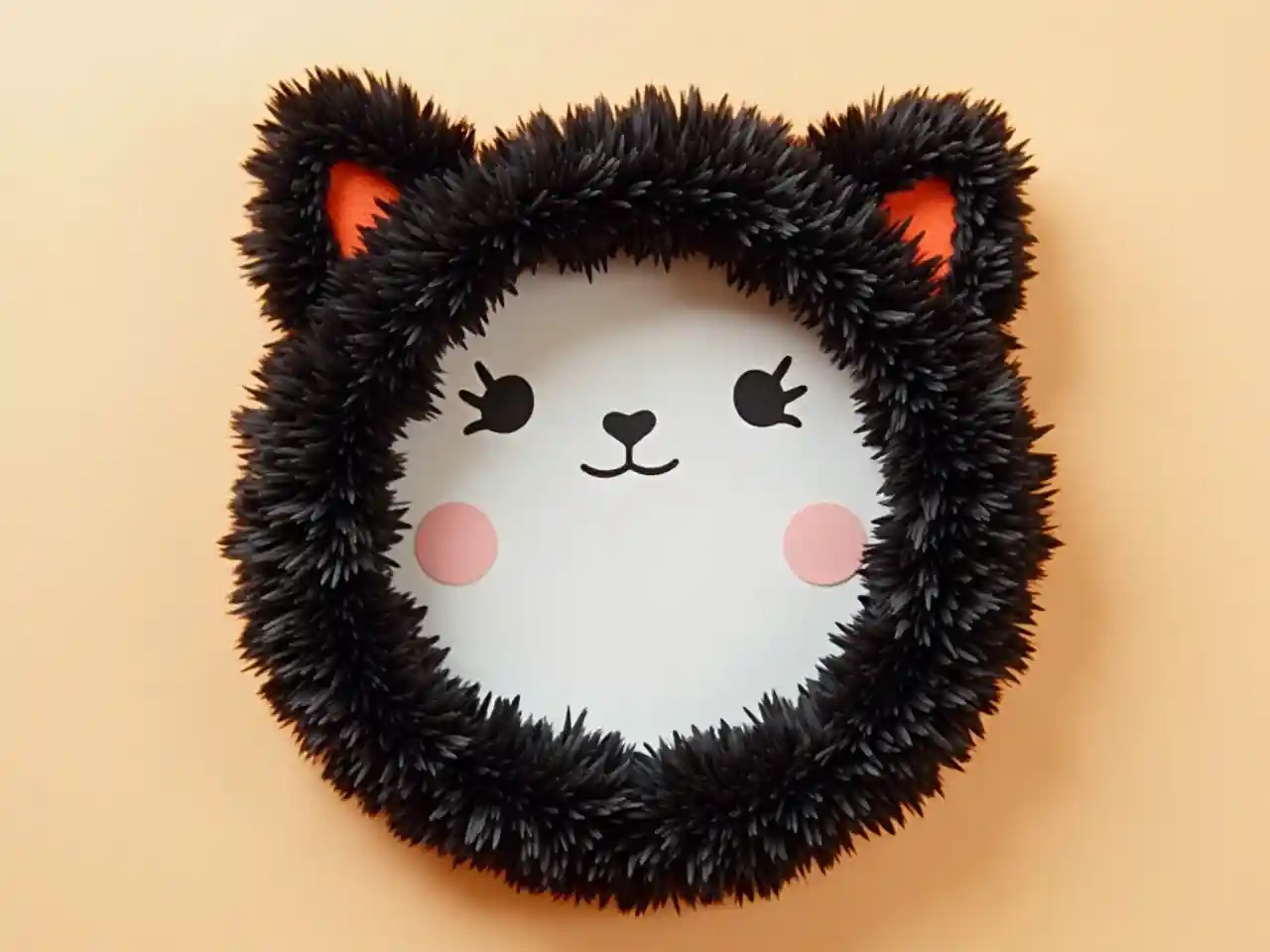La forme moelleuse est assortie à un design de visage moelleux, la forme est faite de tissu moelleux, couleur noire et orange, cadre,